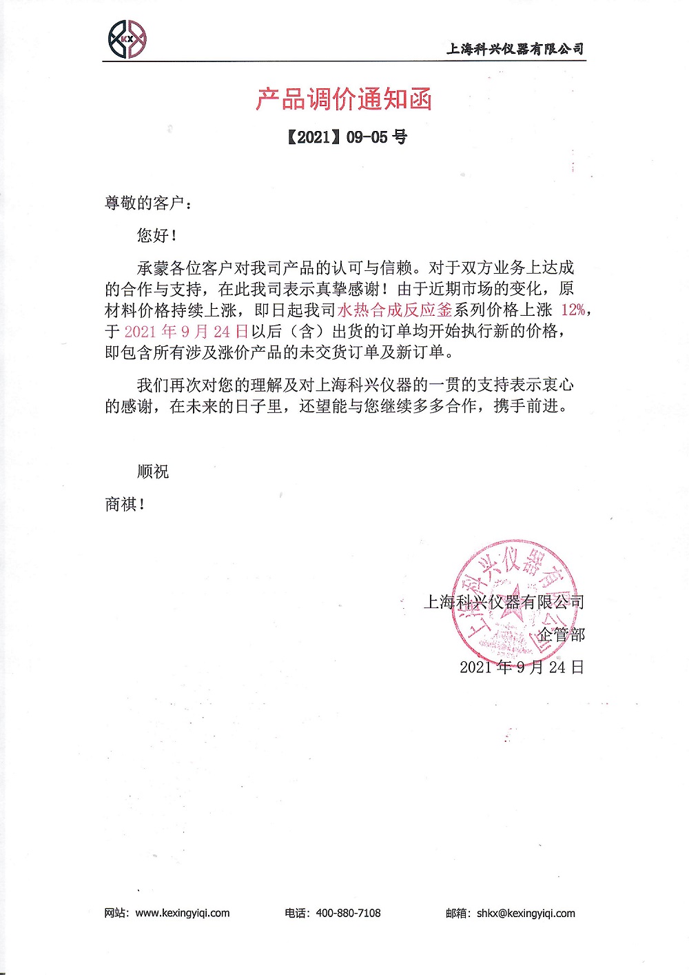 承蒙各位客戶對我司產(chǎn)品的認(rèn)可與信賴。對于雙方業(yè)務(wù)上達(dá)成的合作與支持,在此我司表示真摯感謝!由于近期市場的變化,原材料價(jià)格持續(xù)上漲,即日起我司水熱合成反應(yīng)釜系列價(jià)格上漲 12%,2021 年 9 月 24 日以后(含)出貨的訂單均開始執(zhí)行新的價(jià)格,既包含所有涉及漲價(jià)產(chǎn)品的未交貨訂單及新訂單。